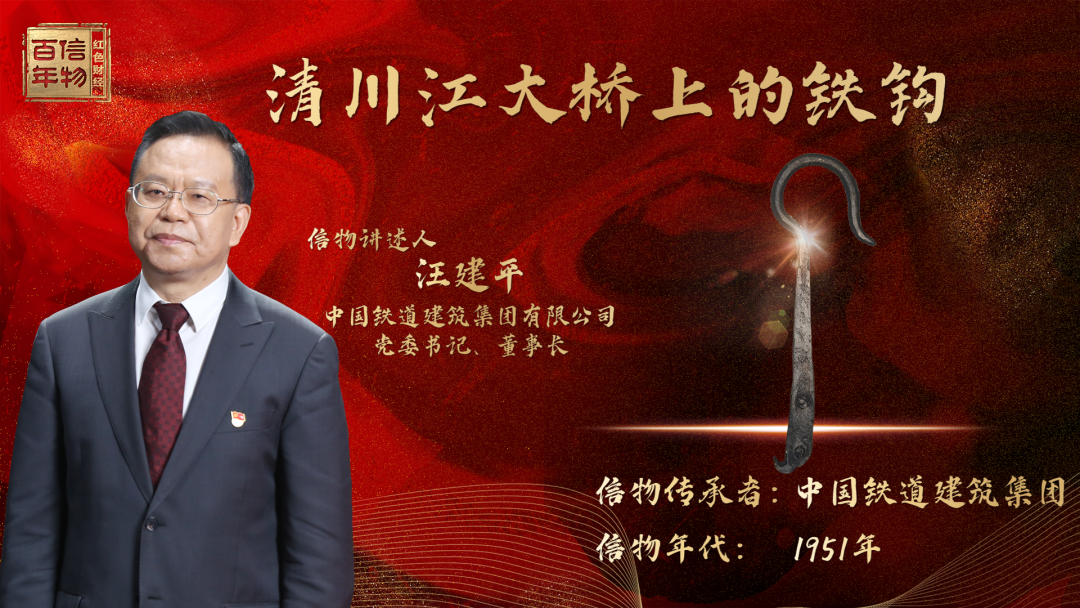 信物名称:清川江大桥上的铁钩信物传承者:中国铁建信物年代:1951年信物印迹:“登高英雄”杨连第在清川江上的架桥工具信物讲述人:中国铁道建筑集团有限公司党委书记、董事长 汪建平