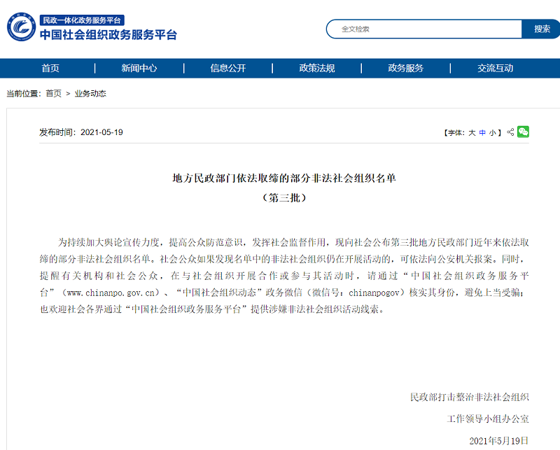 19日,民政部公布了 第三批地方民政部门近年来依法取缔的部分 非法社会组织名单 。