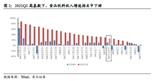 从食品饮料板块整体来看,2020年实现归母净利润1382.82亿元,同比增长18.77%。2021 年Q1 行业实实现归母净利润501.48 亿元,同比增长28.28%,但由于抗周期性和刚需性,在横向行业分类中处于下游水平。