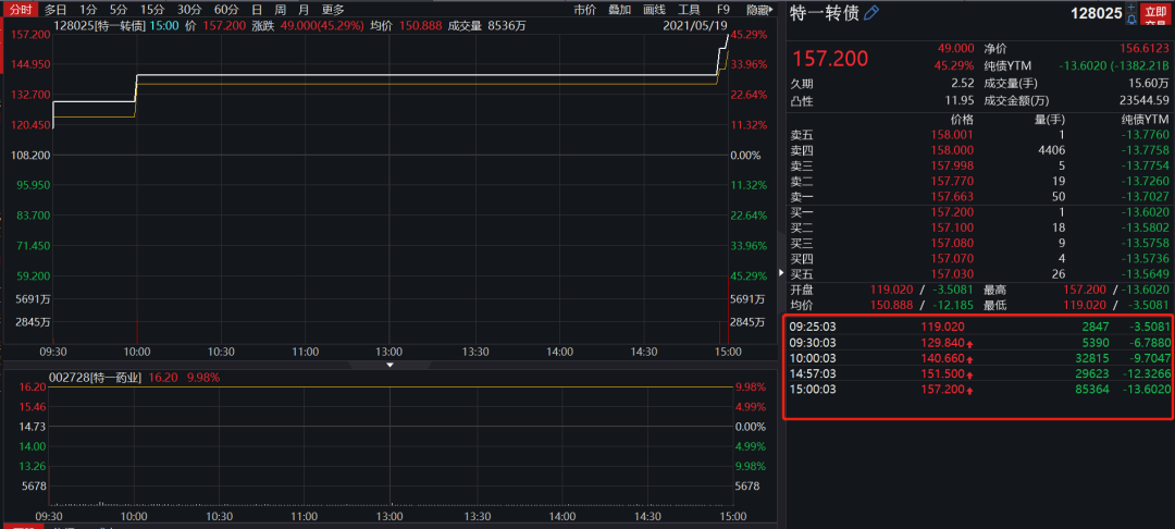 尾盘三分钟复牌后继续大涨。仅用5笔交易,特一转债单日便成功大涨45%。持券人收获满满。