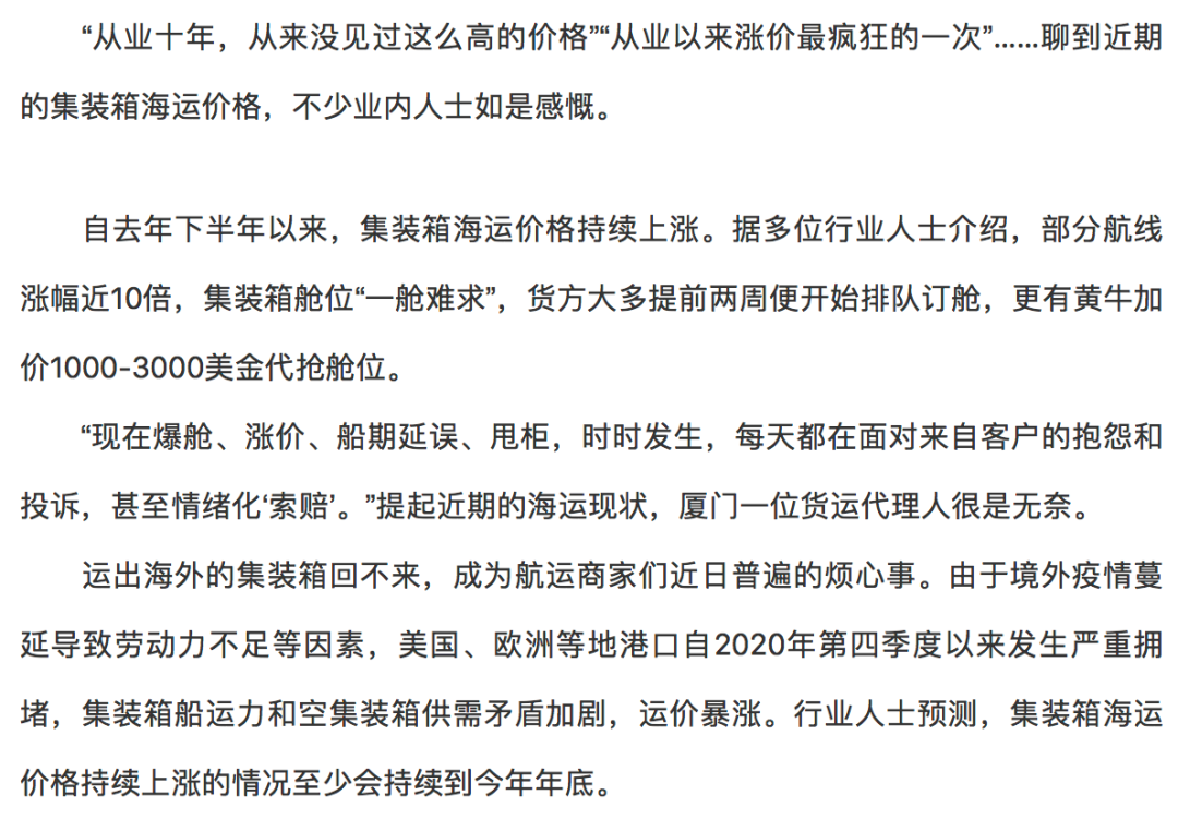 自去年下半年以来,集装箱海运价格持续上涨。据多位行业人士介绍,部分航线涨幅近10倍,集装箱舱位“一舱难求”,货方大多提前两周便开始排队订舱,更有黄牛加价1000-3000美金代抢舱位。