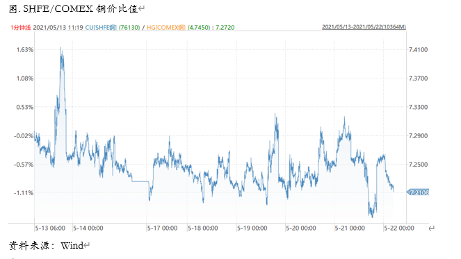 上周SHFE/COMEX比价运行重心在触及此前的低位后开始震荡,正如我们在上周的周报中指出:我们认为目前比价可能在经历了此前较为顺畅的正套逻辑之后再次进入比较纠结的状态之中。主要原因在于目前国内具有加工手册资格的冶炼企业已经着手出口精铜,此举对于缓解国内精铜供应压力有一定作用,但是同时可能会对海外精铜的去库带来阶段性压力,不排除海外出现交仓等行为。我们认为需要关注印度为首的新兴市场国家在本轮疫情中的供应问题,如果后期新兴市场国家供应受到扰动,海外精铜平衡表将出现阶段性紧张,则国内的出口并不足以覆盖缺口,正套逻辑将重新清晰。