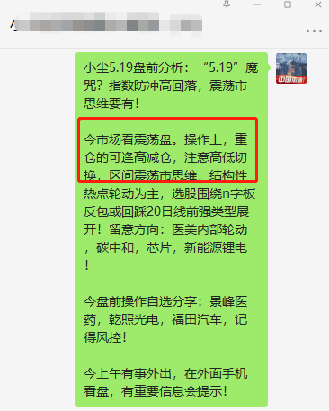 小尘盘中突发:盘中突发信息提示,精选尾盘一股! 小尘复盘:分享交易日复盘,分析大盘走势、主流热点解析,分享实盘等! 免责声明: 1, 以上投资建议仅供参考交流,不作为买卖依据,提到的个股,只为分享,不作为个股推荐,股市有风险,要有自己的进出逻辑!