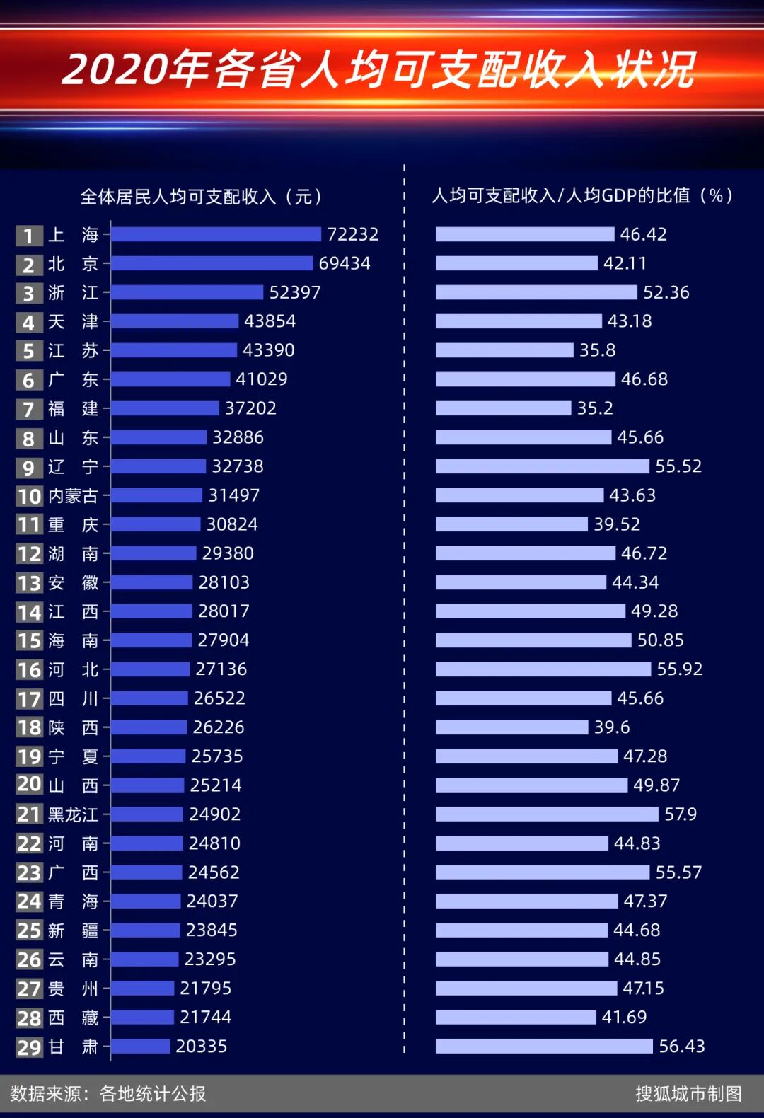 各省2020年人均可支配收入状况/搜狐城市制图 就在京沪2020年人均可支配收入在7万元上下的同时,国内还有9个省份人均可支配收入还不足2.5万元。其中甘肃2020年人均可支配收入全国垫底,仅有20335元。 个人可支配收入的增长首先取决于经济增长,同时与分配关系和分配格局有关。 总体来看,2020年人均可支配收入10强省份与人均GDP10强省份的重合度较高。人均GDP前10的省份中,除排名第9 的湖北因没公布收入数据未入榜、重庆可支配收入排名第11位外,剩余的8个省份2020年可支配收入均位列十强。 但就具体位次而言,仍有细微差异。 以浙江为例,2020年浙江省人均GDP排名全国第6,但同期浙江的人均可支配收入却仅次于京沪排名全国第三。 此时,就不得不提一个重要数据,即人均可支配收入占人均GDP的比重,通过这项数据大致可以体现一个地区的价值分配机制,这个比值越高,意味着居民从经济增长中获得了较高的福利。 统计结果表明,已公布数据的29个省份中,共有7省人均可支配收入占人均GDP的比重超过一半,其中黑龙江以57.90%的占比位居第一。 而同期陕西、重庆、江苏、福建4省这一比重还不足4成,其中福建为全国占比最低的省份,2020年人均可支配收入占人均GDP的比重仅为35.20%。可见,对福建而言,从人均GDP到人均收入还需要一个大的跨越。 上海交通大学安泰经济与管理学院教授陈宪认为,从国际比较来看,目前国内人均可支配收入占人均GDP的比重偏低,我们仍有较大的提升空间,例如设置一个“小目标”,通过若干年的改革与发展,将比重提高到60%的水平。 -03- 北京人均住户存款余额是西藏的近7倍 作为全球居民储蓄率最高的国家之一,国内居民往往倾向于将收入存至银行。 而人均住户存款余额也是体现一地民富水平的重要指标。目前31个省份中,除陕西、海南、山东、辽宁、天津、吉林6省尚未公布2020年全市金融机构住户存款数据外,剩余25省均有数可查。 2020年,北京市人均住户存款余额一骑绝尘。在已知数据的省份中,北京是唯一一个人均住户存款余额突破20万元的省份。 北京之后,上海以超15万元的人均住户存款余额排名第二。