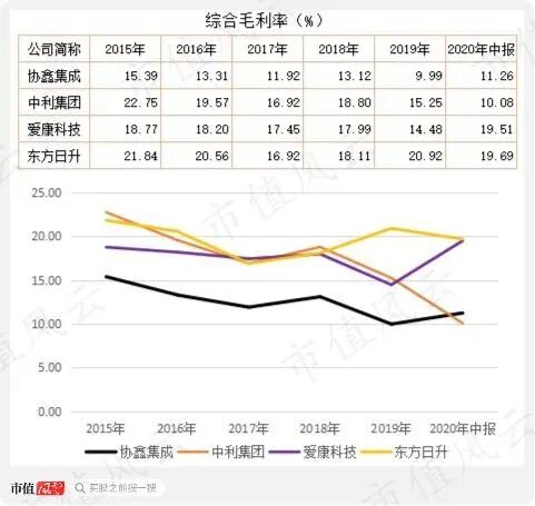 从综合毛利率来看,协鑫集成低于同行业的其他公司,并且呈现下降趋势。