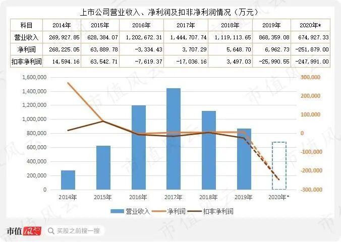2020年的业绩预告显示, 净利润亏损15-25亿元,扣非净利润亏损14.8-24.8亿元 。