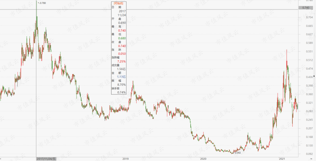 截止2021年3月底,该公司的股价为0.30元,较0.55元的买入成本缩水了44%,也就是说, 上市公司账面累计浮亏至少3.7亿元 。相对而言,其2018年至2020年上半年为上市公司创造的利润合计远不及账面浮亏的1/3。