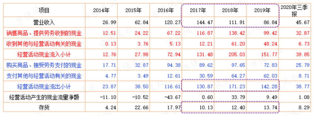2019年也是类似的情况。2019年的营业收入较2017年下降了40%至86.8亿元,但经营活动现金流出金额却较2017年多12亿元达142亿元,是当期营业收入的1.64倍。而更为诡异的是,当期存货并没有出现大幅增加。