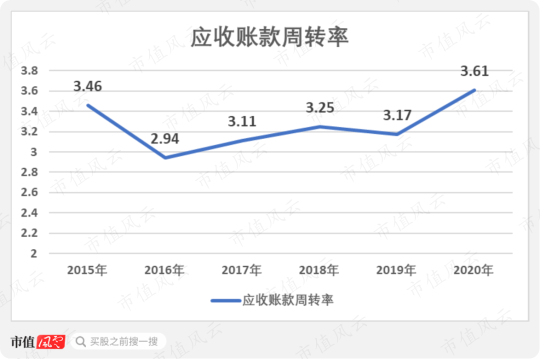 应收账款周转率在2016年触底回升,2020年为3.61次,突破2015年的3.46次,应收账款管理能力相对较好。