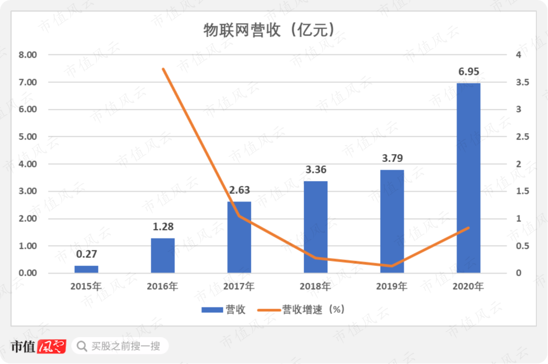 物联网的营业收入从2015年的0.27亿增长至2020年的6.95亿,复合增速达91.43%,其中2020年的同比增速达83.4%。