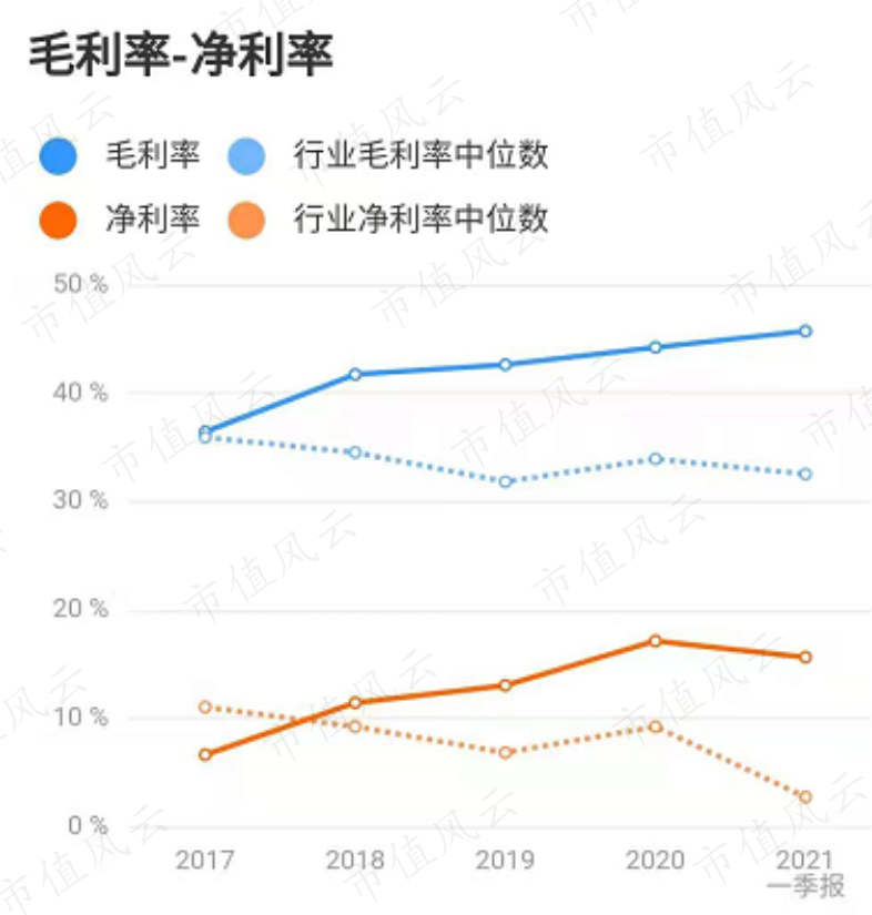 公司的毛利率从2017年的36.4%上升至2021年Q1的45.7%,净利率从6.6%上升至2020年的17.1%,2021年Q1为15.6%,均明显优于行业中位数,盈利能力明显增强。
