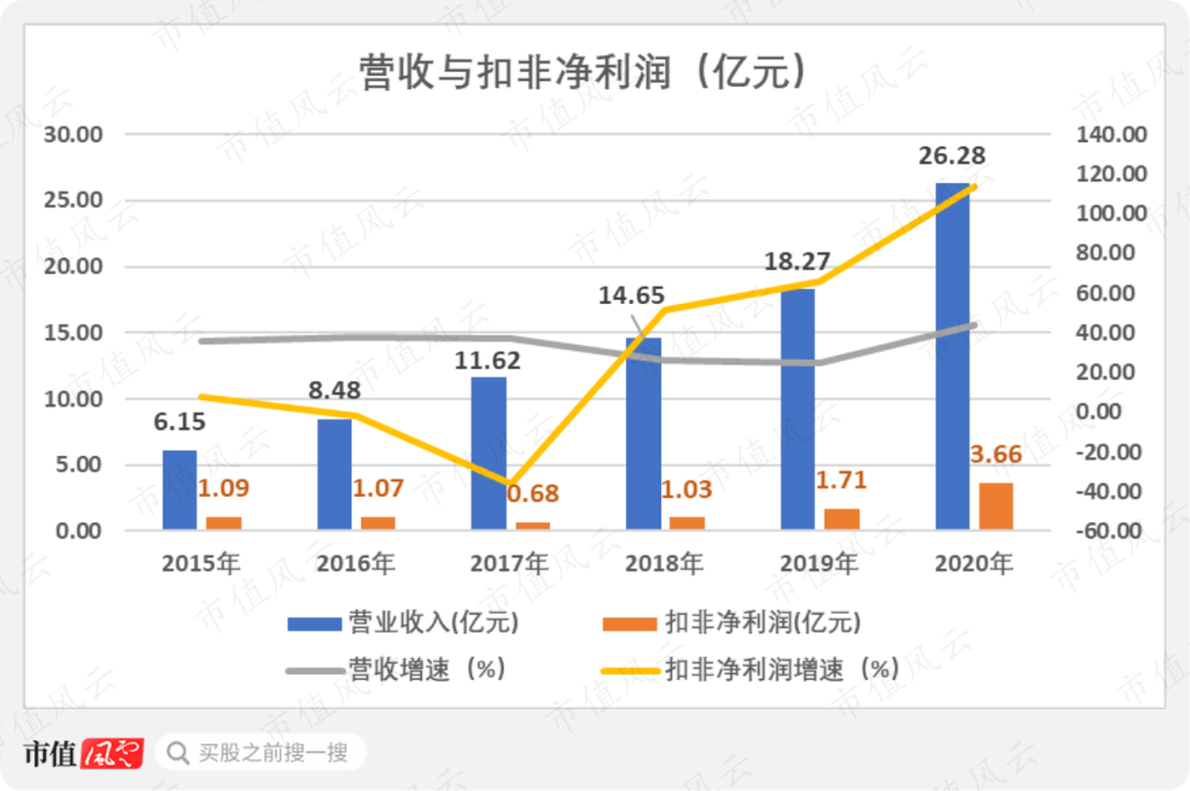 同期扣非净利润从1.09亿上升至3.66亿,复合增速为27.41%。但波动性较大:2016年至2017年出现明显下滑,而2018年至2020年增长迅猛,其中2020年的增速高达113.95%,创历史新高。