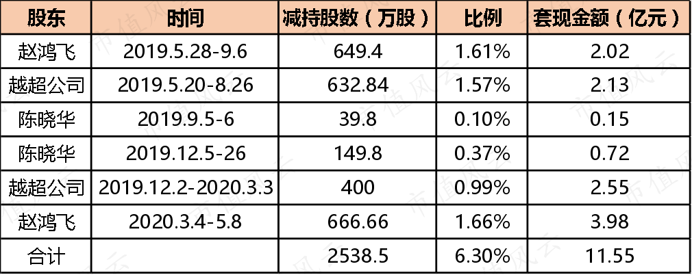 根据风云君统计, 赵鸿飞、越超公司和前任董事陈晓华合计减持了2538.5万股,减持比例达6.3%,套现了近12亿元。