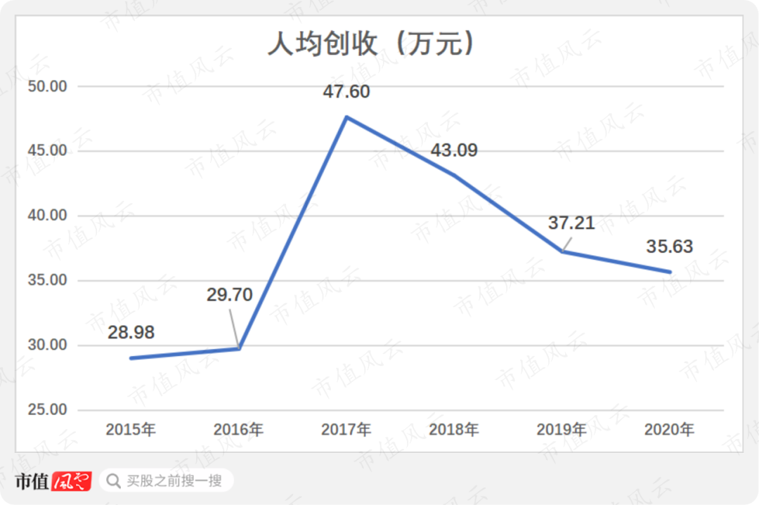 人均创收在2017年达到巅峰47.6万元后,逐年下滑至2020年的35.63万元,表明公司在营收快速扩张时人员扩张过快,创收效率出现下滑。