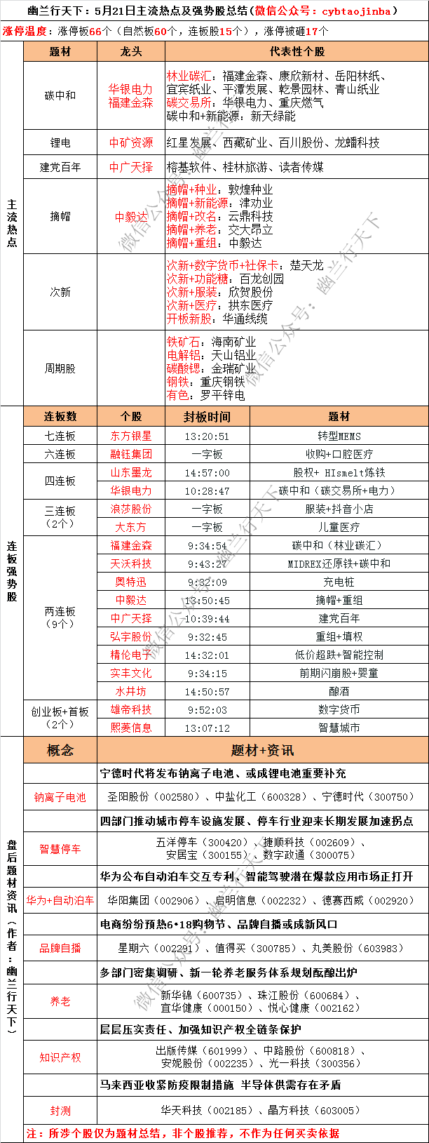 盘面热点比前一天更为活跃,但多数热点都是只有几个票在活跃,那类热点是不宜看板块效应炒股的,等你以为是板块起来了而追个跟风票大概率是立马就被坑的节奏。论板块效应的话只有碳中和概念具备,方向主要是碳交易所和林业碳汇这两块,算是逻辑直接挂钩的两大块。当中的林业碳汇概念已经高潮,需要向碳交易、碳监测、新能源等其他方向发散才有板块的持续性,除了交易端就是能贡献碳配额的那些。其实多数本就是前期强势股的回春,股性记忆贡献不少,若不能发散开来的话那就是部分人气个股反复的模式。短线还可以关注但不盲目,作为曾大炒过的热点还是得注意节奏问题,前期那些人气股也可能轮涨轮歇。钢铁+煤炭+有色等周期板块也逆市,表面上看是有点受碳中和概念刺激,实质上连续大跌后的回抽。他们本是高排放的主体,原来炒碳中和的逻辑主要在于供给侧改革带来的涨价,然后上方对大宗商品的一再调控等于就把这个逻辑卡死了,短期就不宜再当碳中和概念去炒,回抽一下就会是抛压重重。