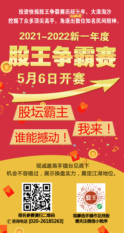 2021-2022投资快报股王争霸战实盘大赛中,选手老包周一收益10.87%,5月赛至24日为为止,盈利已达65.46%,位居首名位置。第二名的韭菜王5月收益也达25.12%。前十名选手收益最少的也有14.42%。究竟这些高手现在持有什么股票,周一又做了什么买卖,请点击进入“投资快报股王争霸”小程序,就可一窥究竟。