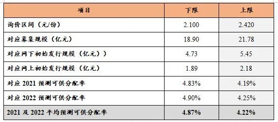 在询价区间内,假定2021年预测可供分配金额一定情况下,不同定价结果对于2021年预测可供分派率敏感性分析如下: