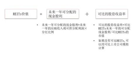 股息收益率法在逻辑上类似于运营净现金流倍数法(Price to FFO),区别在于该方法主要基于股息而不是现金流来对REITs进行估值。由于大多数国家均要求REITs将高比例的“可分配收入”作为股息支付,而“可分配收入”又与REITs的现金流高度相关,因此股息收益率法也是基于现金流视角的估值方法。运用该方法时需要用REITs未来一年的可分配现金股利除以可比的股息收益率来得到REITs的价值。