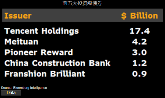 在投资级中资美元债中,单A级科技巨头腾讯和低BBB级送餐平台美团在发行规模上主导一级市场。腾讯发行的是较长期债券,为20年和30年期债券,而美团则通过可转债市场发行了两只零息票债券。