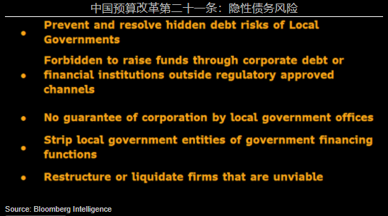 2. 中国针对地方政府实体的政策 4月13日,国务院发布了《国务院关于进一步深化预算管理制度改革的意见》,其中第二十一条针对债务风险,特别提及地方政府的隐性债务风险。国务院要求取消地方政府担保,严禁地方政府通过企业实体融资,并重申对失去清偿能力的企业要依法实施破产重整或清算。