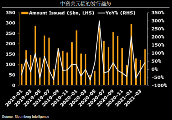 我们预计,由于到期债券较少叠加市场波动,债券发行放缓的趋势可能继续。由于投资级和高收益债券市场均企稳,2021年5月,一级市场中资美元债(即功夫债)的发行可能仍会较从4月的低基数略有复苏。佳兆业集团发行的2亿美元高收益债券是本月最受追捧的个券之一。
