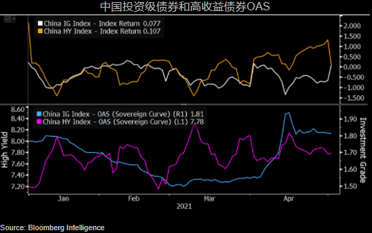 尽管中资美元债(又称功夫债)可能不会在5月遭到抛售,但从历史角度来看相对较高的估值仍可能在今年晚些时候推动回调的加深,尤其是在高收益房地产领域。由于美债收益率较4月初的高位有所回落,投资级债券有望于5月企稳,而高收益债券也可能受到到期日的支撑。(彭博行业研究)