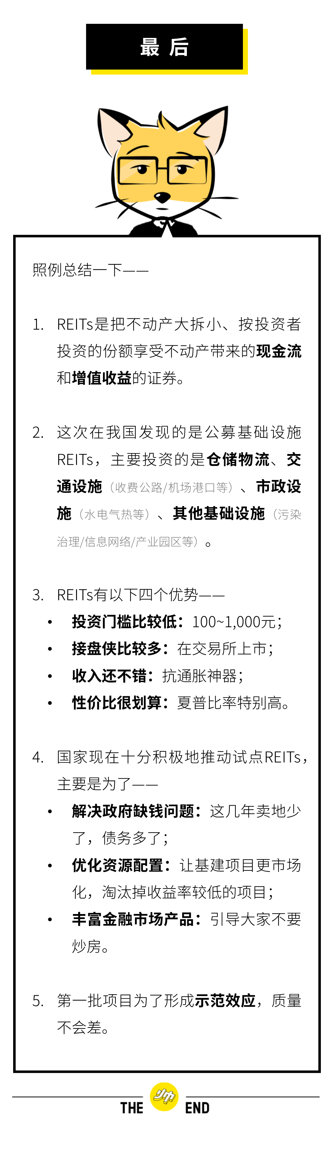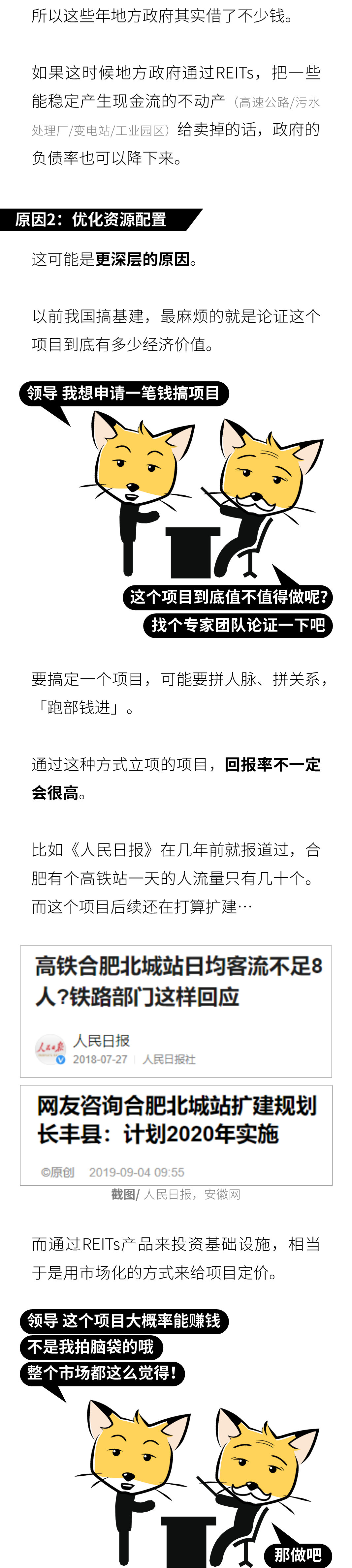 参考文章/ 《中国ZJ会 国|家FG委关于推进基础设施领域不动产投资信托基金(REITs)试点相关工作的通知》《公开募集基础设施证券投资基金指引(试行)》《公募 REITs 新规+细则全覆盖(独家划重点)》《REITs海外实践与中国制度》《千呼万唤的中国公募REITs》《公募REITs镜鉴》《关于REITs发展的十个观点》《观点聚焦:REITs大门徐徐开启》《证|监|会住|建|BU开REITs试点 这类企业将被优先考虑》《一文看懂住房租赁证券化首份文件:房地产开发模式将真正改变》《市场规模最高达12万亿!中国公募REITs未来已是必然趋势》《网友咨询合肥北城站扩建规划 长丰县:计划2020年实施》《高铁合肥北城站日均客流不足8人?铁路|部|门这样回应》《基础设施REITs介绍》《5 Types of REITs and How to Invest in Them》