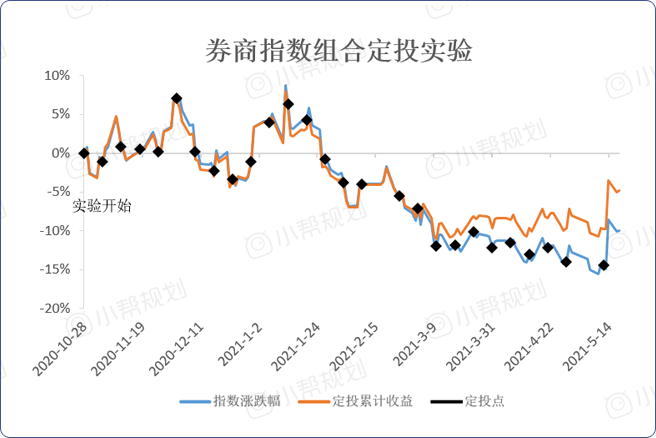 截至上周我们进行了第27次小帮券商指数组合定投实验。截至昨日,实盘账户累计收益率-4.86%,跑赢指数收益5.09%。