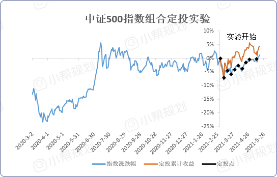 第11期中证500组合定投小实验,本期的操作是: 正常定投(1份资金)。