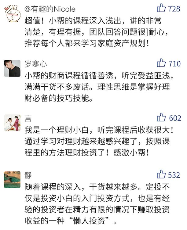 《小白理财直播课 》 课程好评连连!许多学员通过理财摆脱了迷茫和焦虑,学习到终生受益的理财技能,改变了自己的生活。你还在等什么呢?快来加入我们吧!