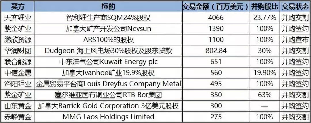 2014年,中国五矿组成的联合体最终以70.05亿美元的交割金额获得拉斯邦巴斯铜矿项目,一跃成为全球前十大铜矿生产商;2015年,紫金矿业以25.2亿元获得卡莫阿铜矿一半的权益,当时该矿评估总储量约2400万吨,,随后该铜矿探明总储量增至4249万吨,增长近一倍,紫金矿业顺势成为中国企业中拥有铜最多的企业之一;2016年,洛阳钼业先后收购了巴西铌、磷资产和刚果tenke铜钴矿,合计金额高达53亿美元,让洛阳钼业一跃成为全球第二大的钴、铌生产商和巴西第二大磷肥生产商。2018年,天齐锂业以40亿美元收购全球第二大锂业生产商SQM,紫金矿业又以13.9亿美元收购加拿大Nevsun矿业公司,鹏欣资源11亿美元并购ARS公司100%股权2018年能源/新能源/矿产领域中资海外并购TOP102019年,紫金矿业宣布将以约10亿元收购已发行的艾芬豪矿业股份;山东黄金计划超短期融资100亿,推断极有可能有新的并购计划;江西铜业在二级市场收购了第一量子公司不超过9.9%的股权,消耗资金约8亿美元……国内矿企并购步伐仍在加快!