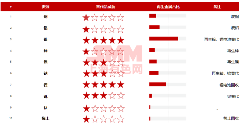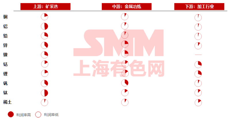 近日,上海有色网副总裁胡健某会议演讲表示,目前,大多数有色金属利润集中在矿业资源端。传统矿业进入难度相对较小,战略小金属矿业有一定的技术或政策门槛,未来对于原生矿业的替代主要来自于再生金属的冲击。铜、铝 、镍仍被认为是投资机会最大的有色矿产,钴、锂新兴金属被认为是机会与风险并存的有色矿产,而铅、锌、钒、钛、稀土等投资机会较小。