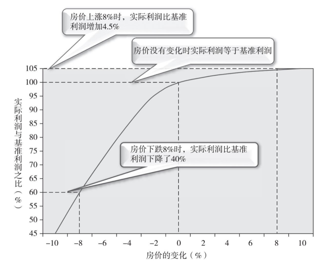 《被平均的风险》一书,用房地产市场的抵押贷款投资组合,来描述了凹函数。假如市场的房价有涨有跌,而平均房价维持不变,那么,你认为该投资组合的利润图会是什么样的呢?在下面的例子里,一半的房价上涨8%,带来不足5%的利润增长;另一半的房价下跌8%,带来的利润下降高达40%。如下图: