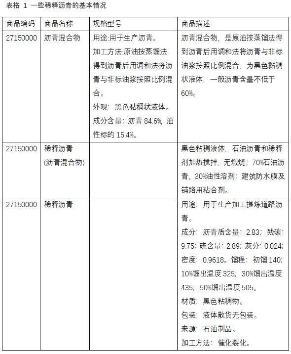 海关网站可查到的一些商品描述如下表,这些商品指标差异较大,但都含有沥青或者沥青质,均可归入税号27150000,也就是说稀释沥青的指标要求并不明确。