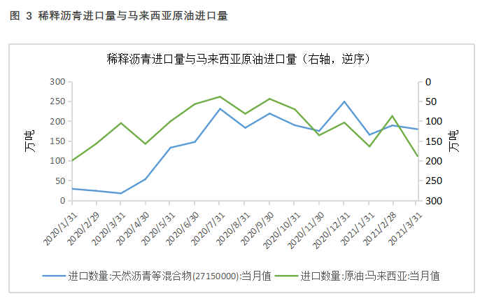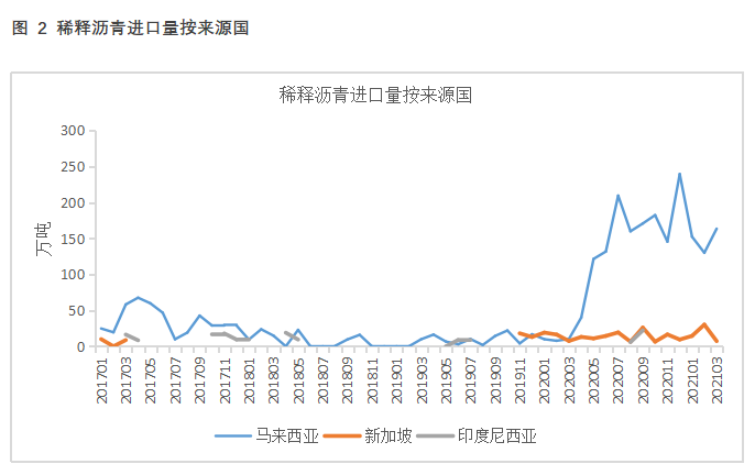 目前我国稀释沥青进口来源国以马来西亚为主。2020年4月起稀释沥青进口量再次出现了增长,据彭博,这时的稀释沥青指标与委内瑞拉Merey原油相似,委内瑞拉原油可能在马来西亚周围的海域通过Ship to Ship方式过驳,再以马来西亚稀释沥青的名义进口到中国。以稀释沥青名义进口原料不需要原油配额,也不需要缴纳消费税,同时在低油价时期缴纳的关税也低(甚至通过中国-东盟自贸区协定享受零关税),所以对于地炼而言,稀释沥青是性价比较高的原料。而在此之前,也就是2019年,Merey原油在马来西亚通过调和或者更换运输船只后更名为Singma或者Mal Blend等油种,以马来西亚原油的名义被进口到中国。随着稀释沥青进口量的增加,马来西亚原油进口量出现了降低。