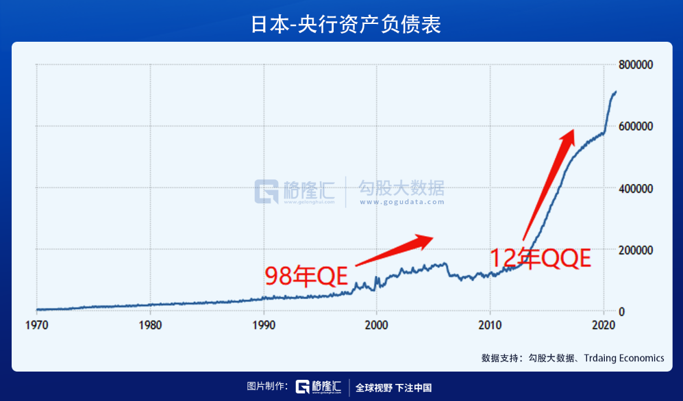 通胀如何形成,在学术界一直都是个争议。 经济学大师弗里德曼认为:通胀在任何时候、任何地方都是一种货币现象。 这句话普及得相当好,所以在大众心中,物价上涨、通货膨胀的罪魁祸首就是货币超发。 但是,如果看日本,似乎并非如此。 过去20多年中,日本在财政、货币上双管齐下,先是普通QE,再是著名的安倍经济学,实行QEE——利率为负的量化加质化货币宽松,进一步加大印钞规模。因此,2012年开始,日本央行的资产负债表规模急剧膨胀。
