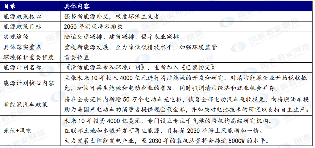表2:美国拜登政府新能源政策资料来源:网站,国泰君安期货产业服务研究所