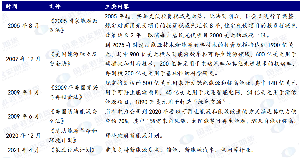 表1:美国新能源政策资料来源:公开资料,国泰君安期货产业服务研究所