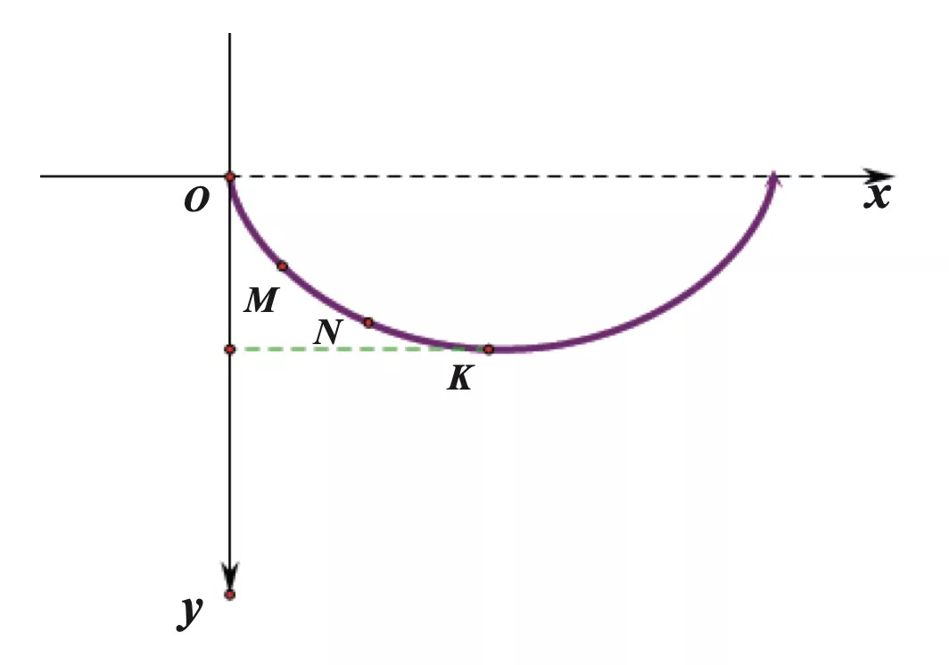 1、球从O滚到K,沿着这条曲线用的时间是最短的,这正是伽利略要找的; 2、球从O点、或M点和N点滚到最低点K的时间都是一样的。