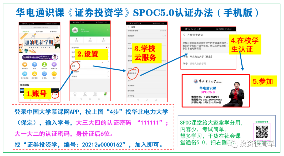 1.加课认证方法 需要到中国大学慕课网,找学校云——“华北电力大学(保定)”注册,大一大二的注册密码:身份证后6位。大三大四的密码:111111。 请看认证示意图。