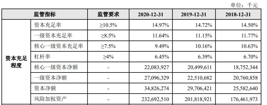 2018年末—2020年末,齐鲁银行的资本充足率分别为14.50%、14.72%、14.97%,一级资本充足率分别为11.77%、11.15%、11.64%,核心一级资本充足率分别为10.63%、10.16%、9.49%。虽然资本充足率上升,但核心一级资本充足率持续下降。