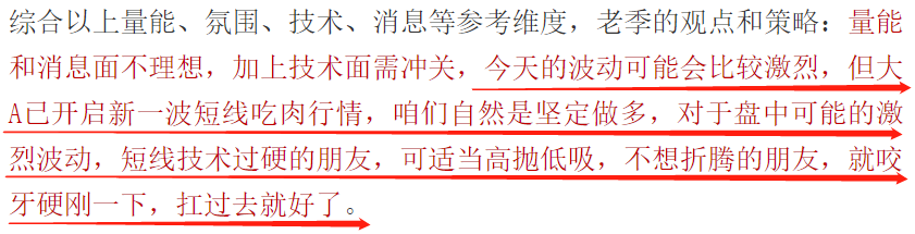 综合以上量能、氛围、技术、消息4个参考维度,老季的观点和策略:大A新一波短线吃肉行情维持良好,咱们自然是继续坚定做多,积极短线博肉吃,至于用多少仓位,朋友们根据自己的风格看着安排。