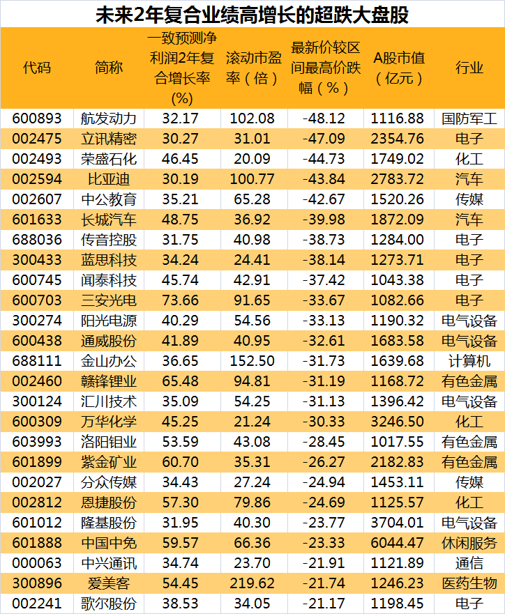 长期看,优质有竞争的企业依然是资金长期关注的方向,股价短期回调并不妨碍公司增长的步伐。在此不妨引入机构预测数据统计,一致预测净利润2年复合增长率超30%的超跌大盘股合计有25家。
