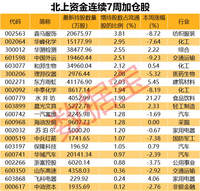 从持股比例变动情况来看,森马服饰获加仓幅度最大,较7周前增持股数占流通股的比例为3.81%;其他连续加仓的还有华峰化学、华测检测、中国外运、和邦生物等。