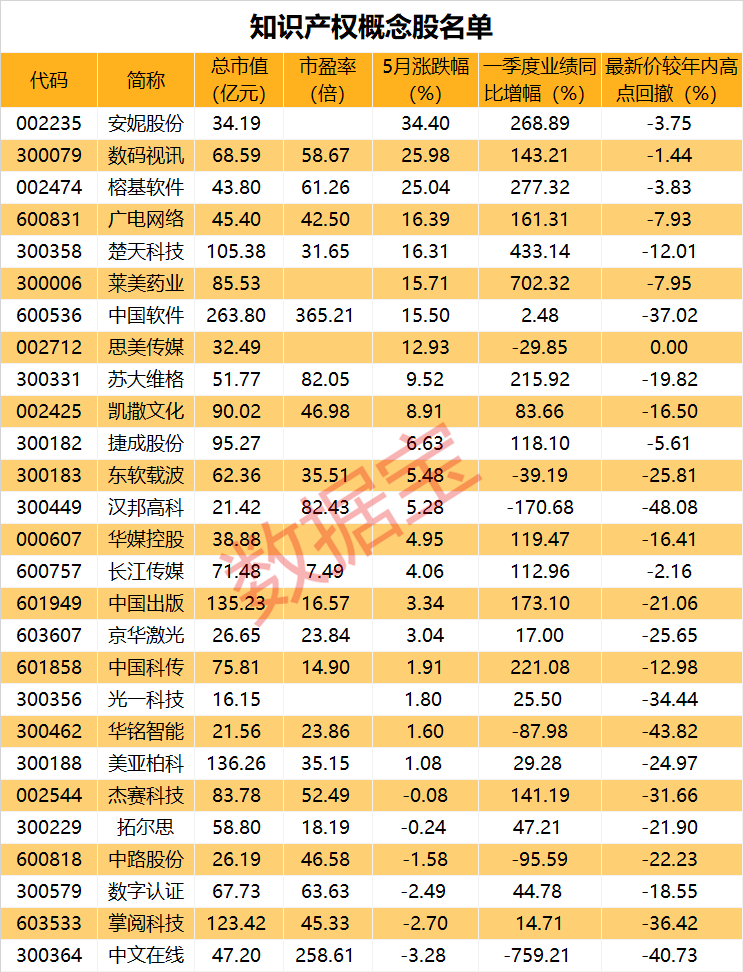 A股知识产权概念共27股。行情走势来看,概念股5月整体“涨势喜人”,27股平均上涨7.76%,大幅跑赢同期大盘(1.46%)。 21股累计上涨,占比近八成。个股来看,安妮股份大涨34.4%,领跑概念。数码视讯、榕基软件紧随其后,双双涨超25%。广电网络、楚天科技等4股也涨超15%。