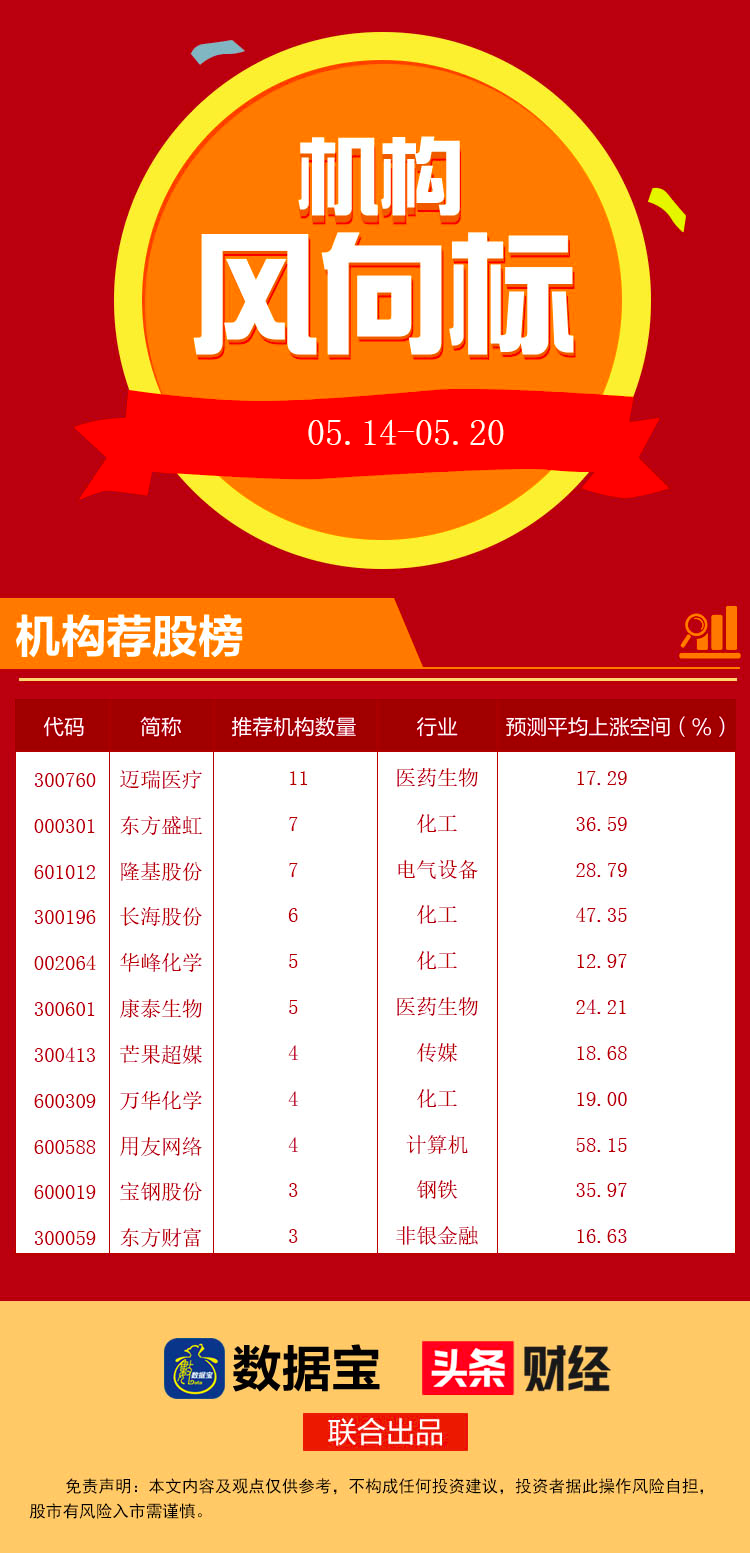 获机构“买入”推荐不少于3次的12只个股中, 后市上涨空间超20%的个股有6只,分别是用友网络,长海股份、东方盛虹、宝钢股份、隆基股份和康泰生物。 其中,用友网络以58.15%的上涨空间一骑绝尘,长海股份、东方盛虹以47.35%和36.59%的上涨空间居二三名。