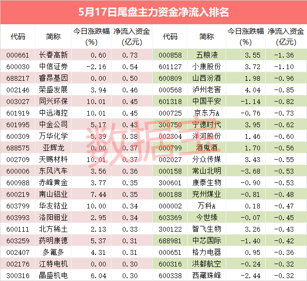 大规模流入的股票也是少数,仅3股尾盘主力资金净流入超0.5亿元,分别是长春高新、中信证券、睿昂基因。疫苗龙头长春高新净流入0.73亿元排在首位,该股今日盘中创下历史高点523元/股,尾盘三分钟集合竞价阶段出现拉升,股价由绿盘翻红,最新市值突破2100亿元。尾盘主力资金净流入较大的还有荣盛发展、同兴环保、中远海控、中金公司、万华化学等。