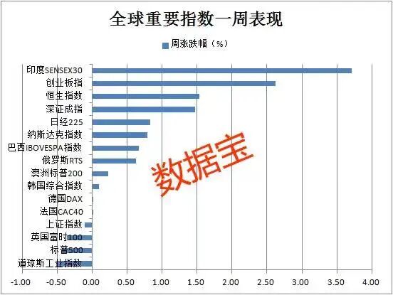 本周,全球重要股票指数涨多跌少,涨幅居前的有印度SENSEX30指数上涨3.71%,创业板指数涨1.62%,恒生指数涨1.54%,道琼斯指数和法国CAC40指数跌幅靠后,分别下跌0.87%和0.65%。