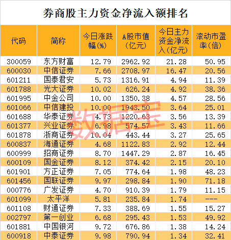 盘后资金流向来看,券商板块主力资金合计净流入106亿元,超半数券商股获亿元以上资金抢筹。资金抢筹最多的是东方财富,该股净流入资金21.28亿元,股价大涨12.79%,最新市值直逼3000亿元。中信证券净流入资金16.47亿元排在其后,今日涨幅7.66%。