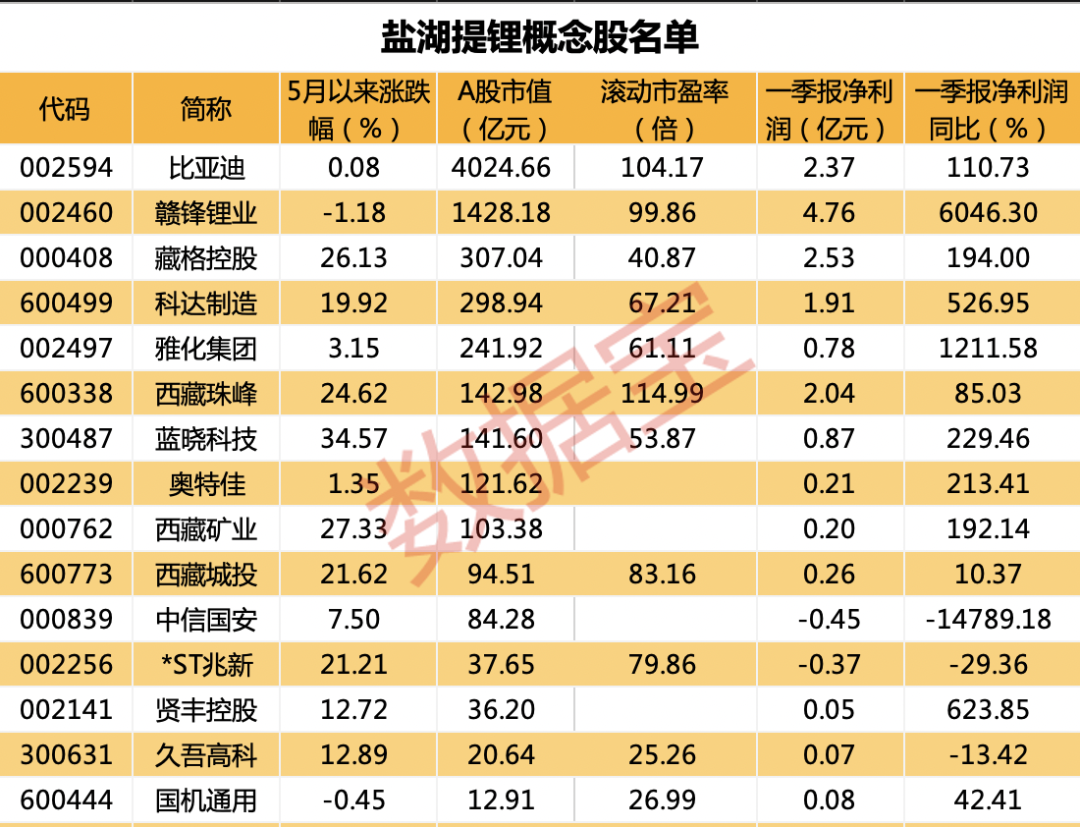 根据证券时报·数据宝梳理,A股中,除了被暂停上市的 *ST盐湖 之外,还有15家上市公司涉及盐湖提锂概念。这15只股的股价自5月以来平均上涨14.1%,大幅跑赢同期沪指(2.38%), 蓝晓科技、西藏矿业、藏格控股、西藏珠峰、西藏城投 和 *ST兆新 6只股的股价累计涨幅均超过20%。